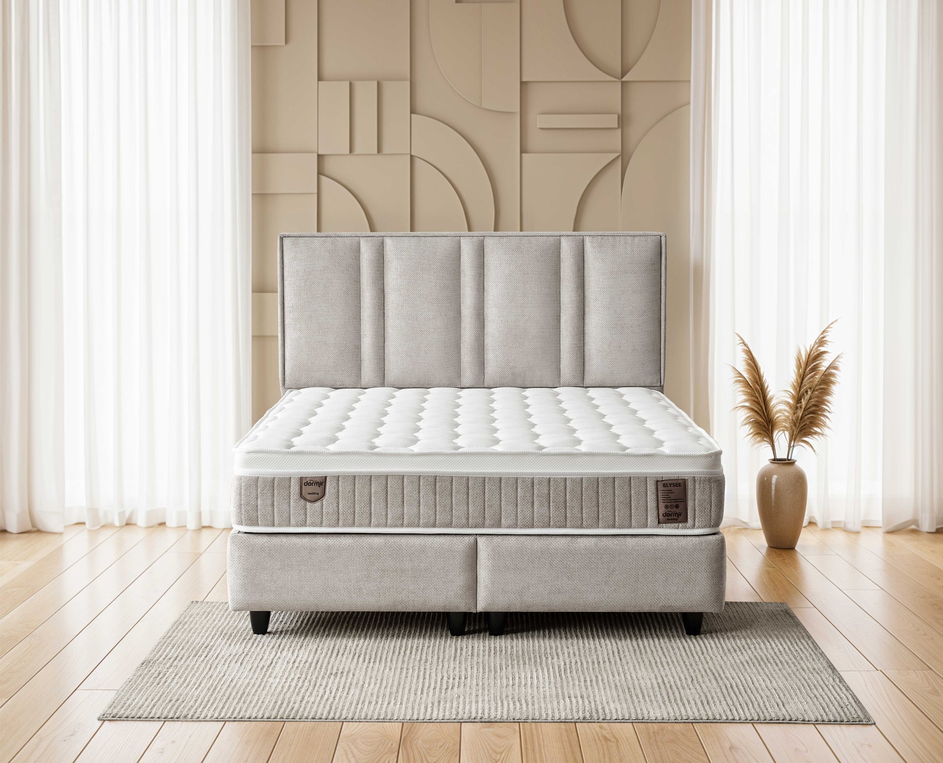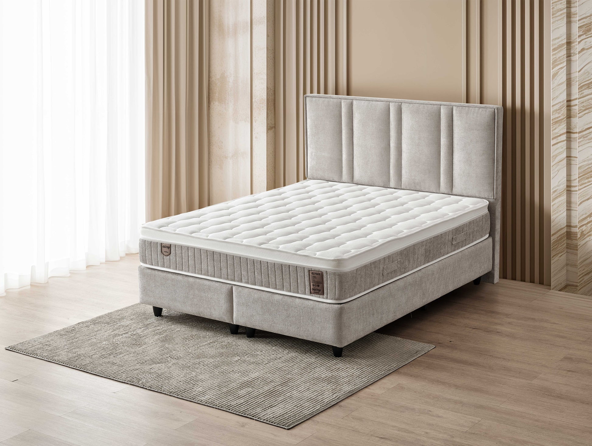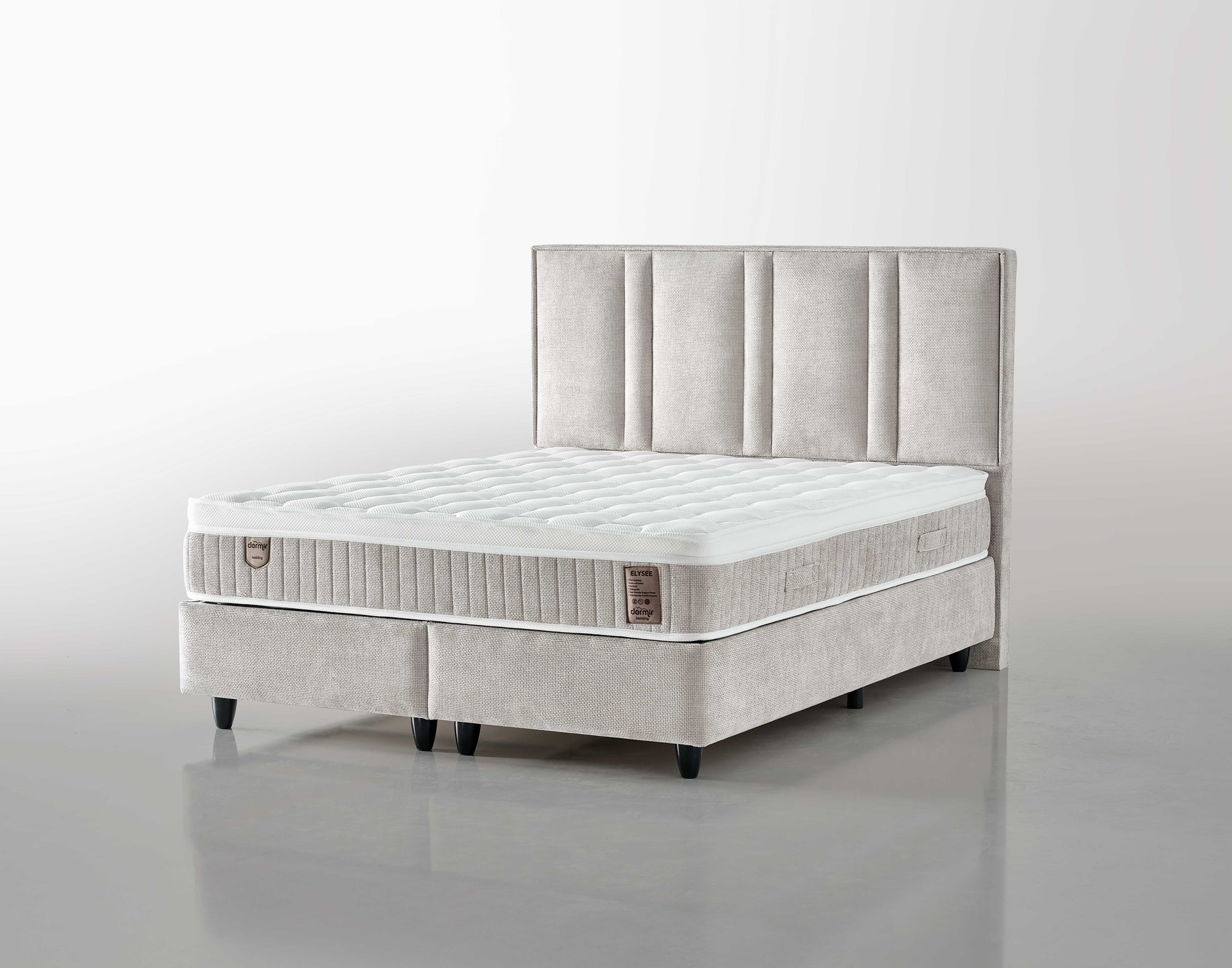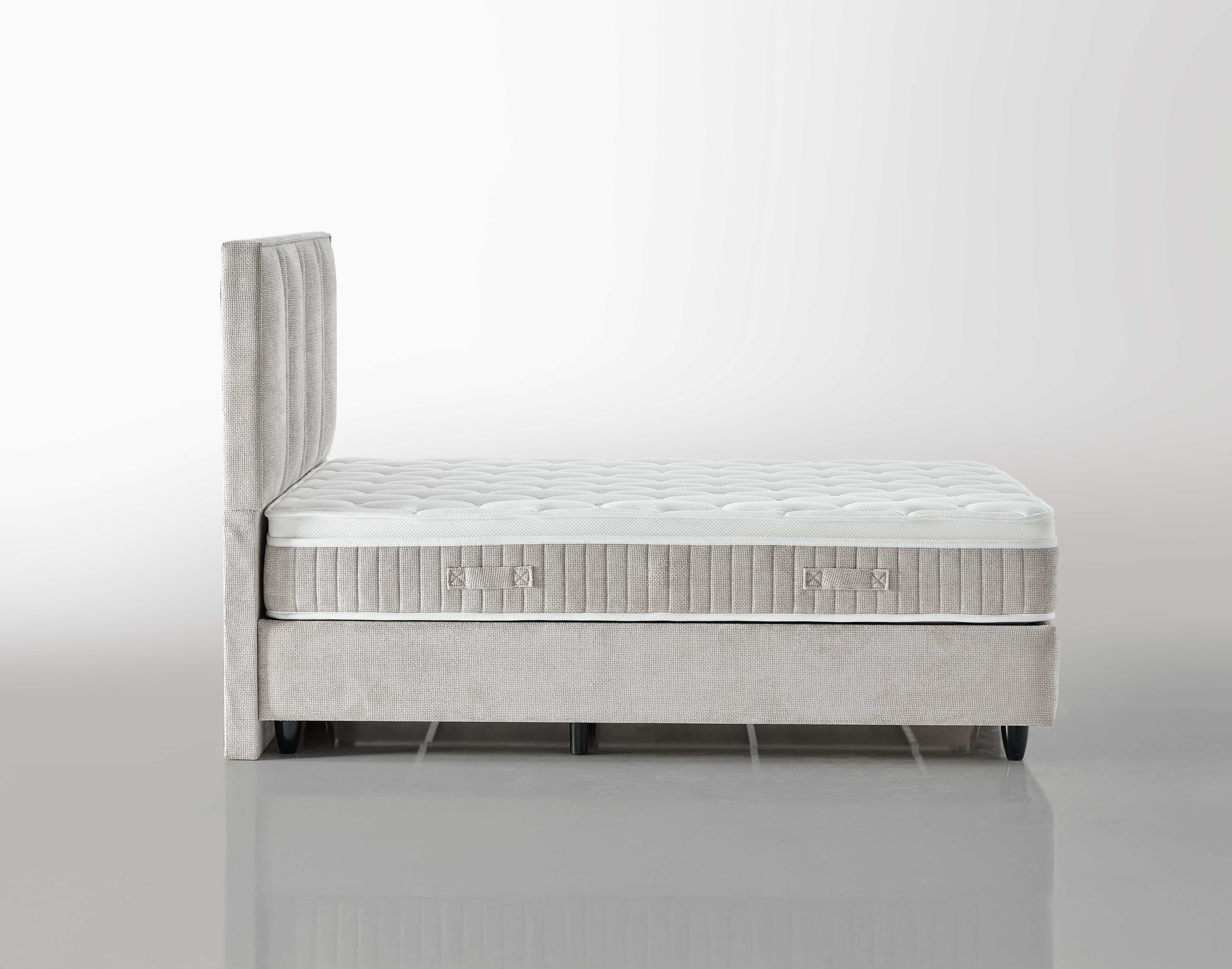 Het Elysee Bed is een toonbeeld van tijdloze elegantie, gekenmerkt door zijn gestructureerde design en uitgebalanceerd slaapcomfort. Het unieke, verticaal gestikte hoofdbord en de stijlvolle taupe afwerking creëren een sfeer van rust en luxe, terwijl het geavanceerde 7-zone matras zorgt voor een perfect ondersteunde nachtrust.