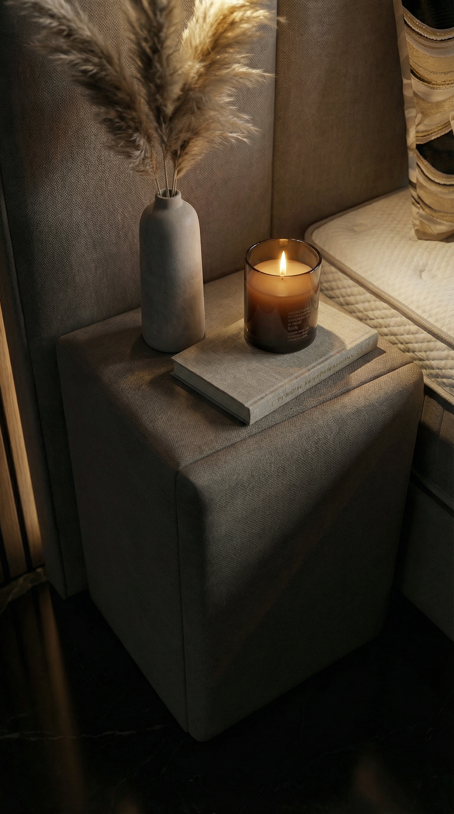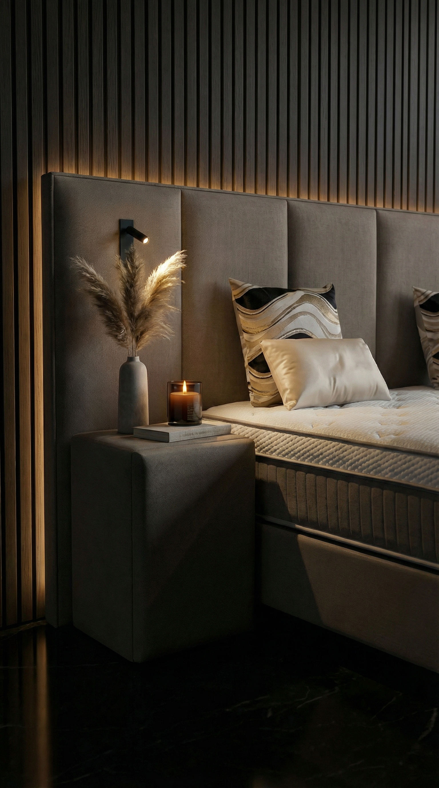 - Verfijnd Verticaal Design: Het bed kenmerkt zich door een stijlvol hoofdbord met verticale channels in zachte, neutrale tinten. Dit gekanaliseerde ontwerp voegt textuur en visuele interesse toe, terwijl het een gevoel van rust en harmonie creëert – perfect voor een moderne, minimalistische slaapkamer.