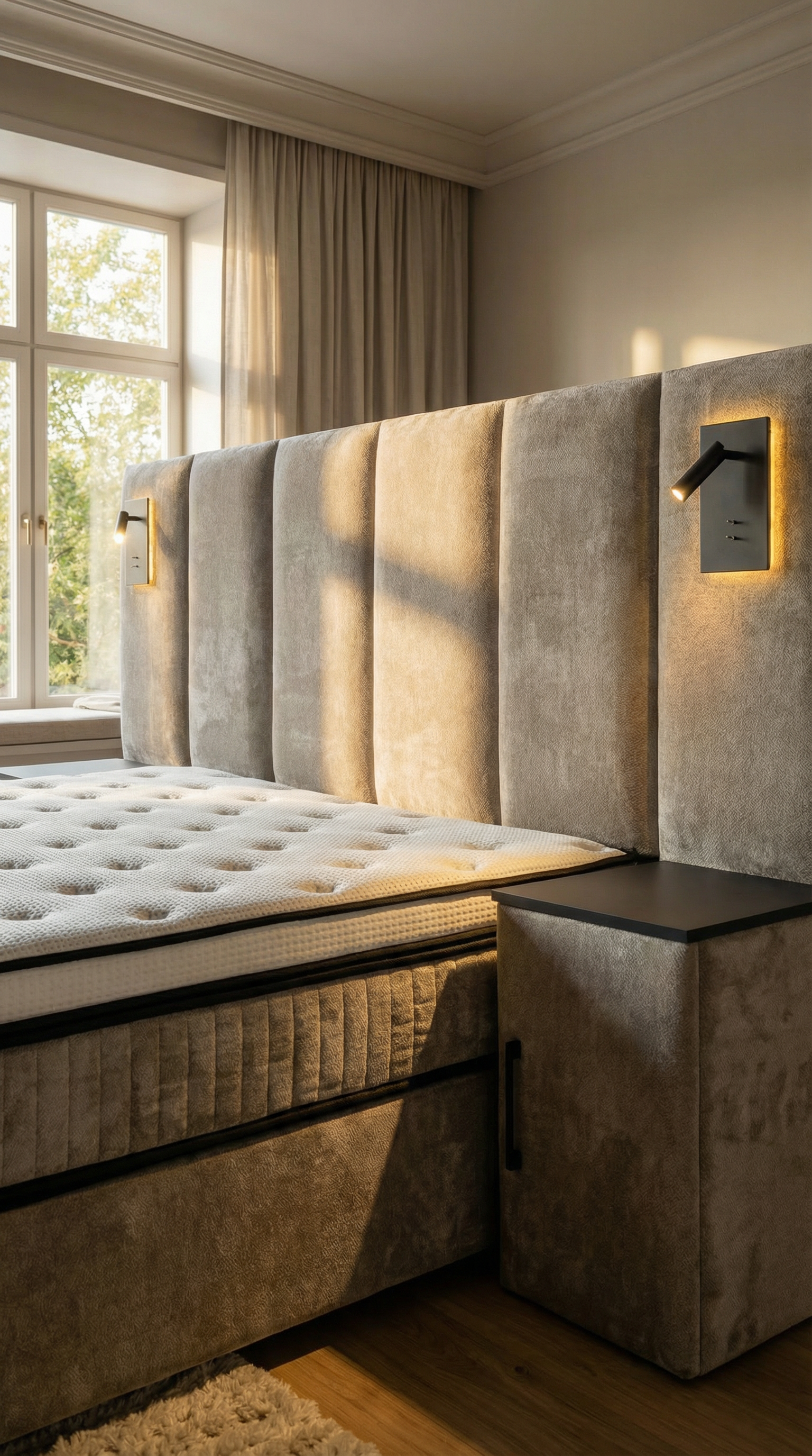 - Hoteldesign Hoofdbord: Uitgerust met geïntegreerde leeslampen en USB-poorten voor extra gebruiksgemak.