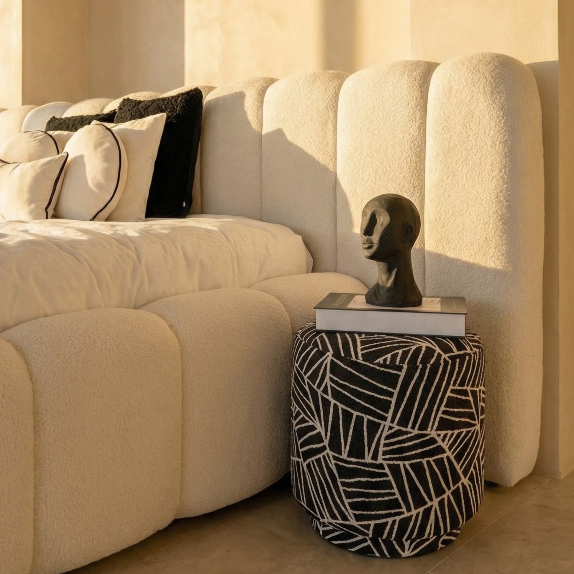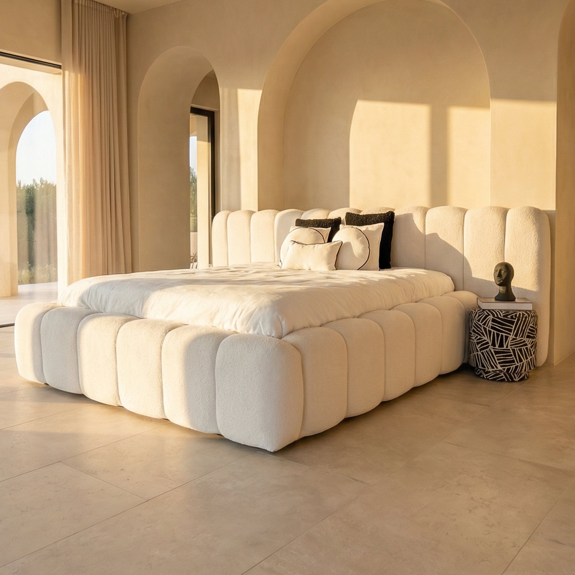 Uitnodigend 'Cloud' Design: Dit bed onderscheidt zich door zijn speelse, afgeronde hoeken en diepe verticale stiksels. Deze 'bubble' vormgeving creëert een trendy, zachte uitstraling die doet denken aan een comfortabele wolk, perfect voor een modern of Japandi-stijl interieur.
