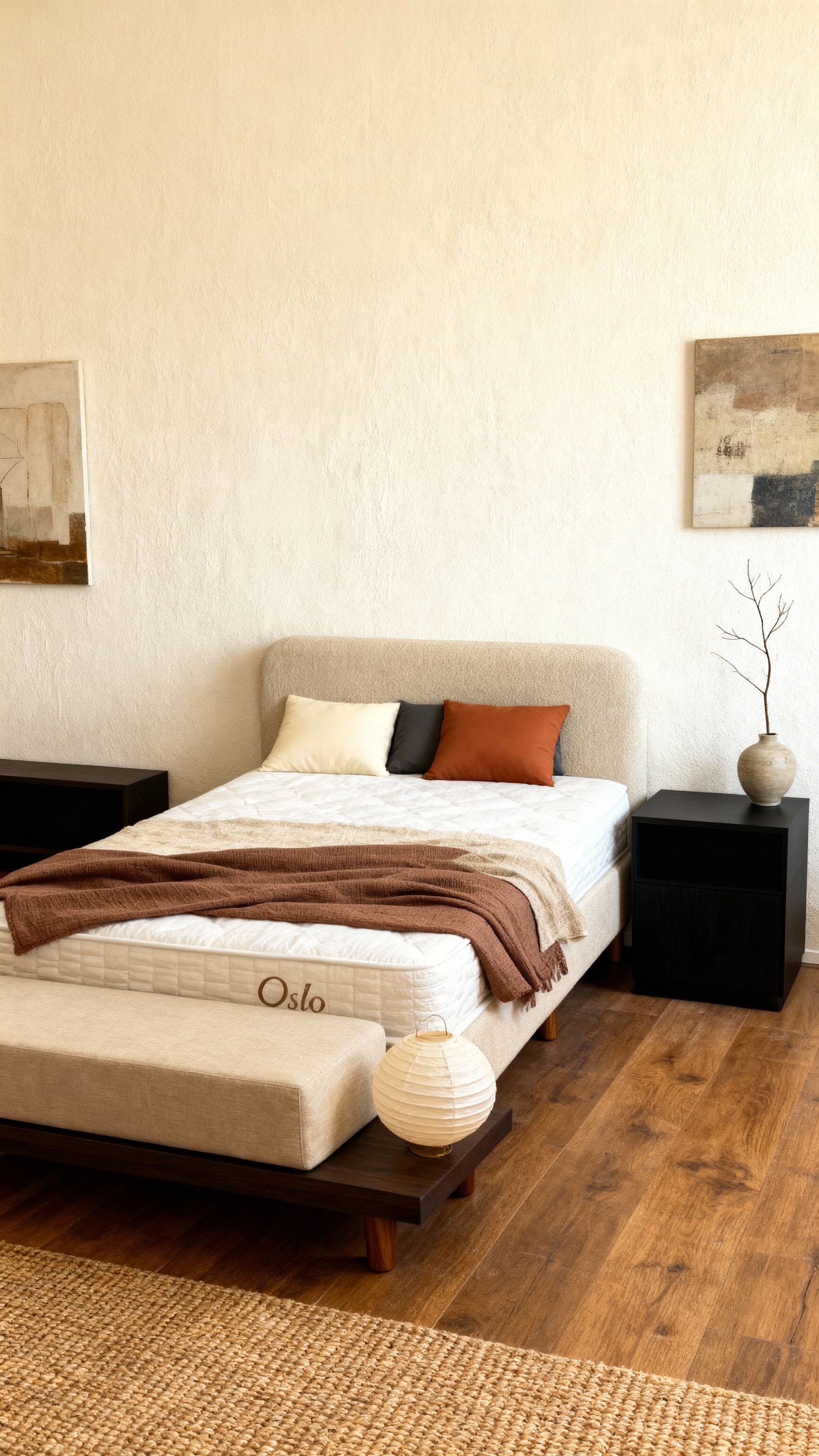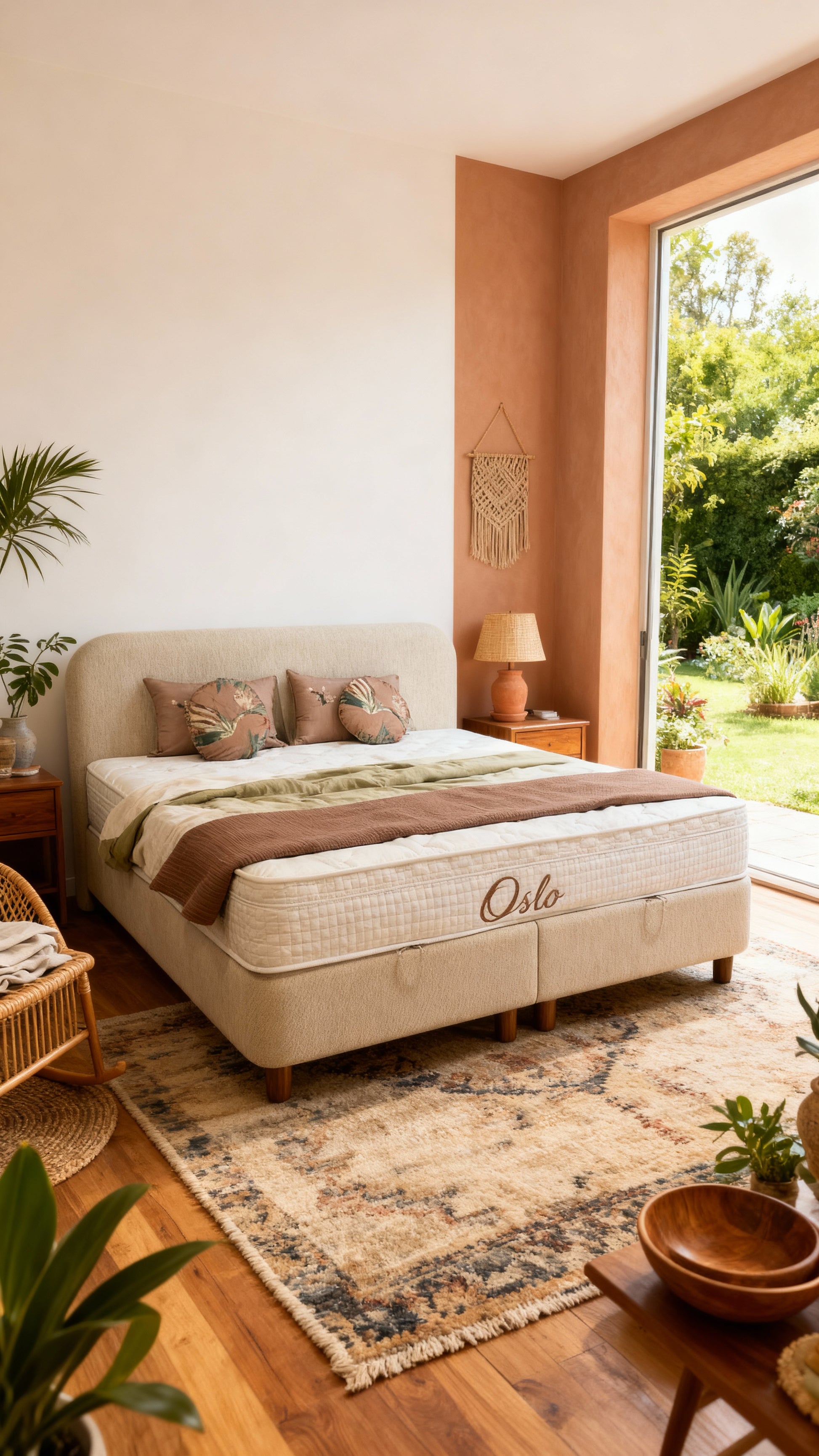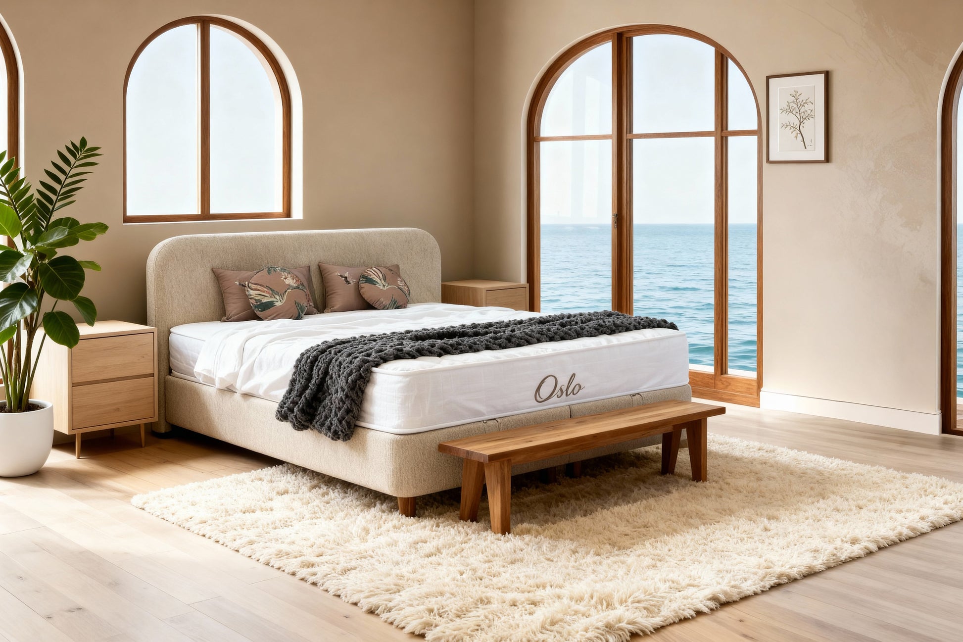 Het Oslo Bed is de belichaming van verfijnde eenvoud en rustgevend comfort, geïnspireerd op een minimalistische, Scandinavische esthetiek. De zachte, crèmekleurige bekleding en de elegante, afgeronde vormen creëren een lichte en serene sfeer.