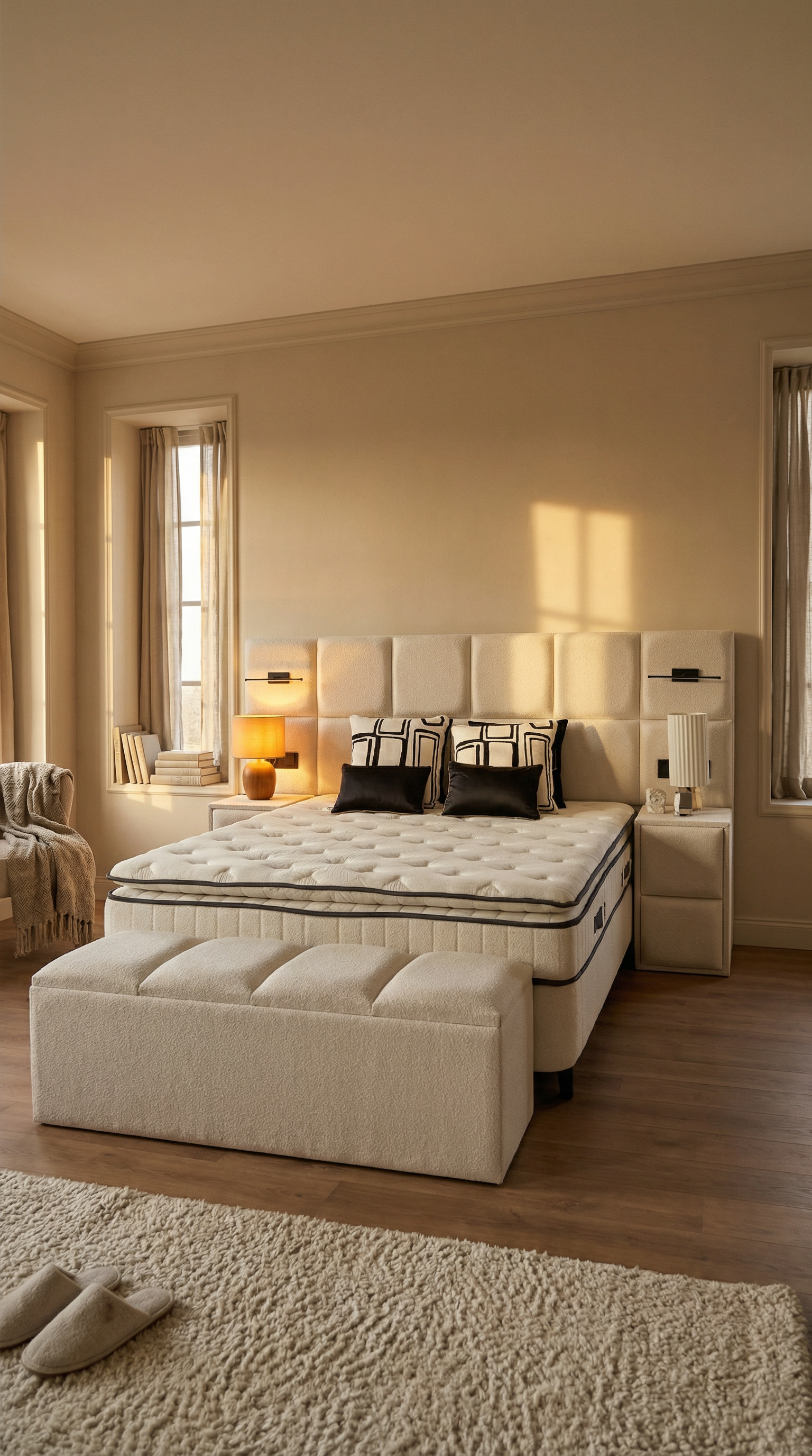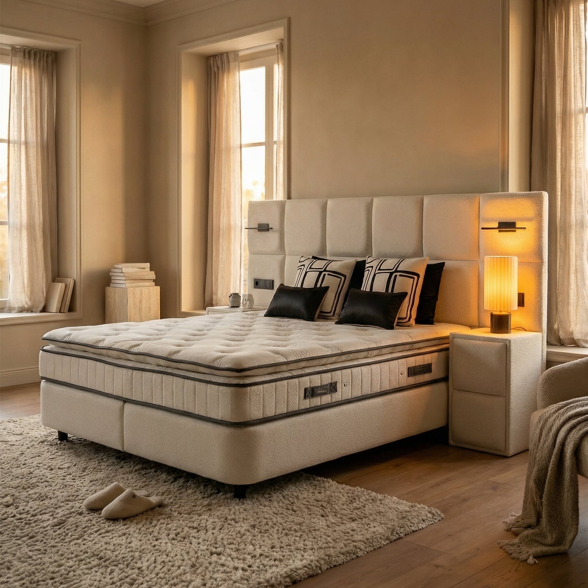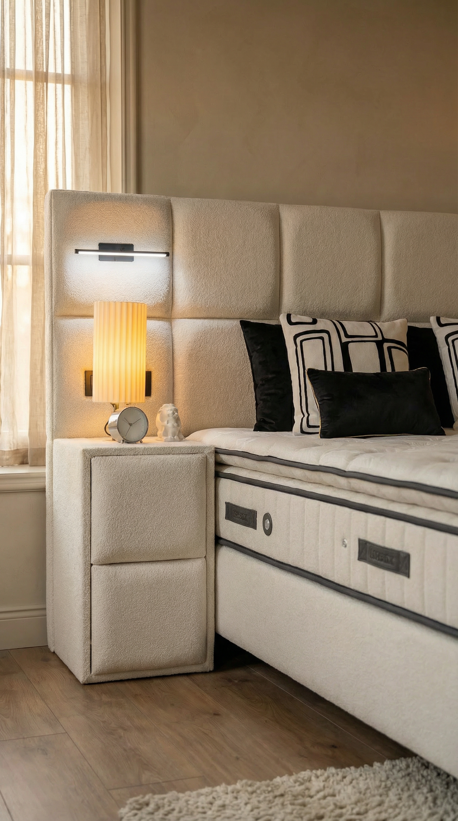 Het Premium bed verenigt een groots en modern ontwerp met de praktische voordelen van royale opbergruimte en een superieur 7-zone veersysteem. Het is een compleet slaapsysteem dat esthetiek en functionaliteit naadloos samenbrengt voor een luxueuze slaapervaring.